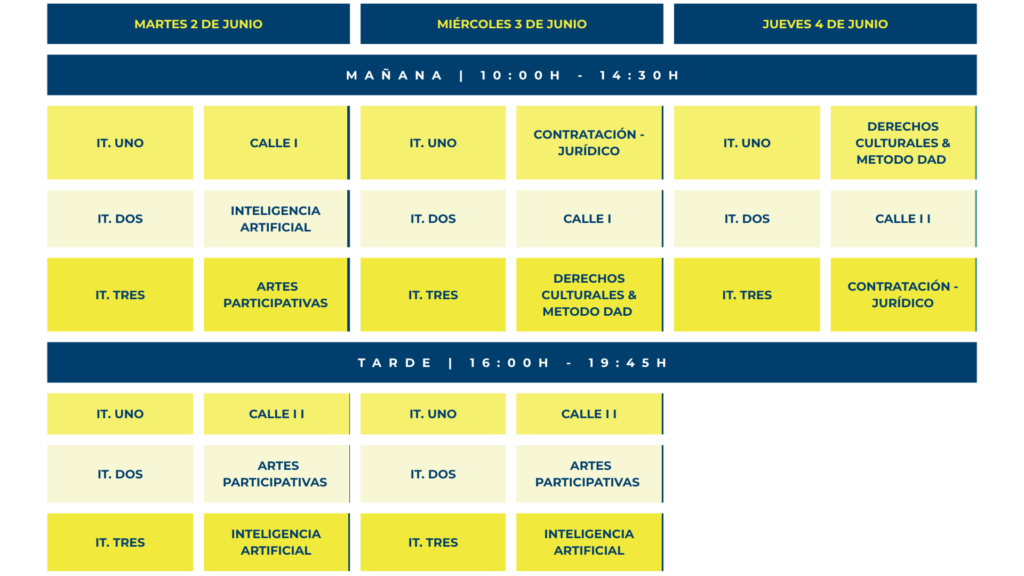 A lo largo de esta XIX edición se abordan dimensiones claves para el desarrollo de cualquier proyecto cultural actual como son la comprensión de los marcos jurídicos de contratación pública, el análisis de prácticas comunitarias, políticas y derechos culturales, la programación de artes escénicas de calle y la adaptación a las nuevas realidades derivadas de la aplicación de la IA en el sector cultural.